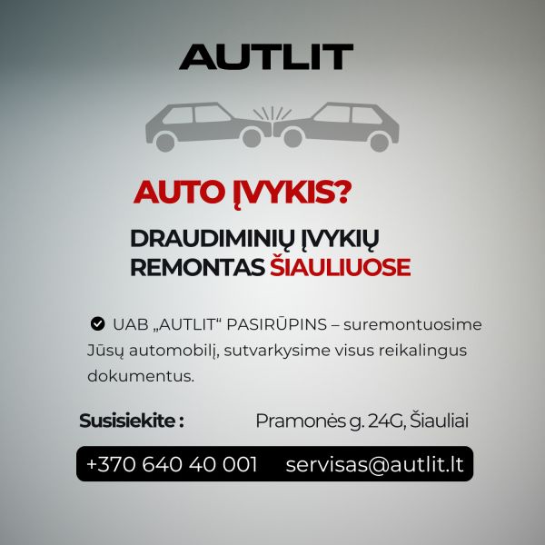 Patekote į eismo įvykį? UAB Autlit pasirūpins viskuo už Jus Nesijaudinkite – mes suremontuosime Jūsų transporto priemonę, sutvarkysime visus reikalingus dokumentus. Mūsų tikslas – kokybiškas, greitas ir sklandus aptarnavimas, atitinkantis Jūsų lūkesčius.